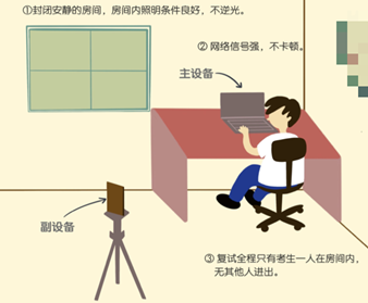为了保障广大师生的安全健康,不能按时返校的考生,ac米兰官方中文网站考试工作将采用Zoom系统进行线上考试。考试前,考生要准备好2个网络视频设备(2部手机或1部手机+1台带摄像功能的电脑等),一个用于发布试题,一个用于监控面试场所。如下图所示: