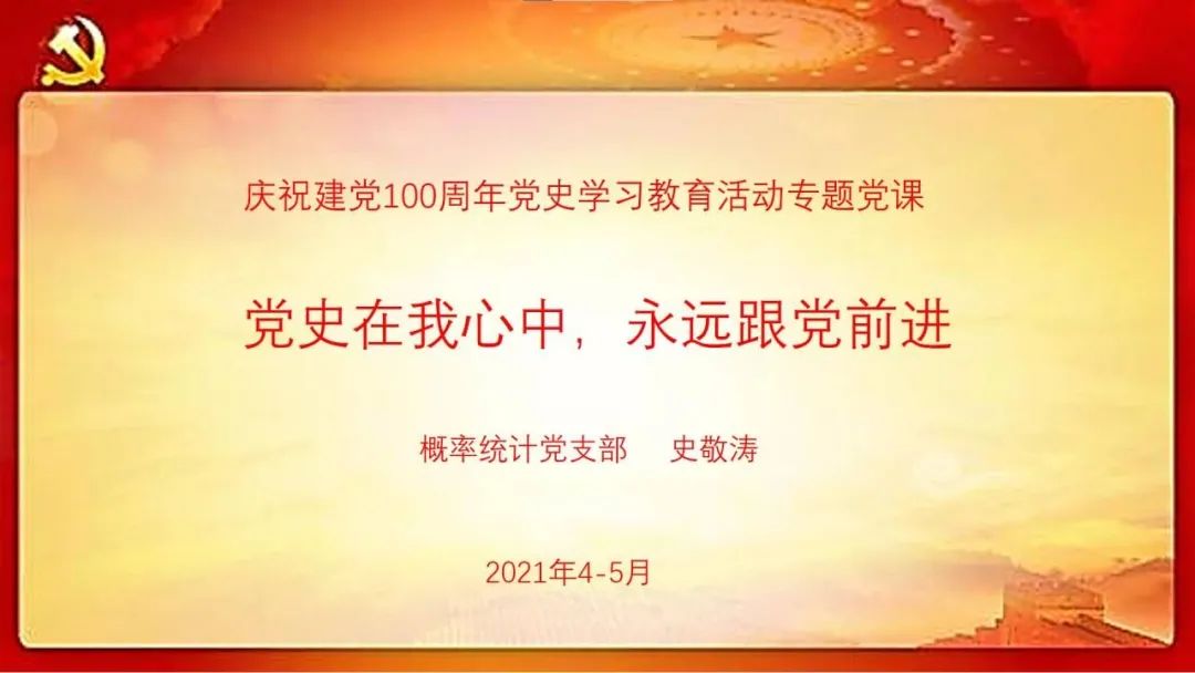 概率统计支部书记史敬涛讲党课“庆祝建党100周年党史学习教育专题党课”已经进行到第五次,党课采用线上形式,准备了大量翔实的党史图片和资料,每次两个学时,深受学院教职工党员喜爱。