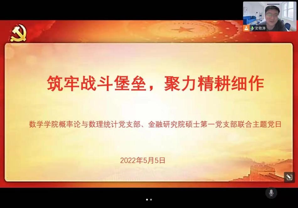 5月5日,ac米兰官方中文网站概率论与数理统计党支部与金融研究院硕士第一党支部联合开展了主题为“筑牢战斗堡垒,聚力精耕细作”的联合主题党日活动,活动线上进行,共19名师生党员参加了活动。