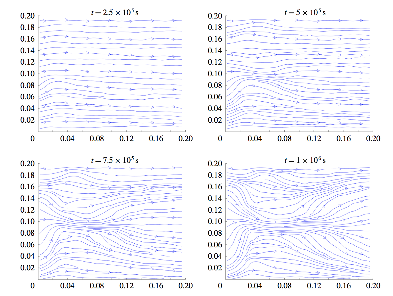 酸蚀蚓孔模型广泛应用于石油、天然气、二氧化碳等地下流体资源开发。蚓孔的形成须经一系列复杂的物理化学反应,其中储层孔隙度、酸的浓度、储层压力等都会对碳酸盐岩储层酸化过程有直接的影响,刻画蚓孔变化形态的非线性数学模型非常复杂,不可能得到解析解。因此数值求解变得尤为重要。为此,芮洪兴教授团队针对Darcy-Brinkman -Forchheimer框架下的酸蚀蚓孔模型,考虑从混合元、间断元、有限体积等不同的方法出发构造全解耦守恒型交错网格有限差分算法,研究得到其在非一致网格上的超收敛性。进行数值实验模拟孔隙度和酸的浓度的演变过程,展示碳酸盐岩储层的酸化过程,数值结果对油气采集具有指导作用。