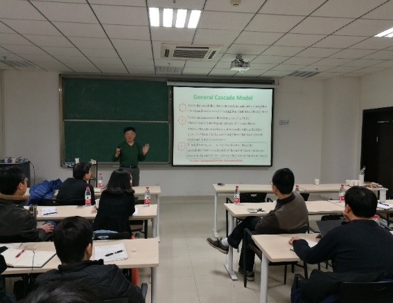 在此次会议中,ac米兰官方中文网站讲座教授、德克萨斯大学达拉斯分校(UTD)计算机系教授堵丁柱作了题为“Information Maximization Problem”的专题报告,在此专题下分别做了题为“Bharathi-Kempe-Salek Conjecture”、“Kemple-Kleinburg-Tardos Conjecture”、“Profit Maximization”、“Randomized Algorithm”的分题报告。堵教授从基础模型Independent Cascade Model和Linear Threshold Model出发,讨论了如何搜索影响力最大的k个节点的几种近似算法,并给出了近似比和相关证明。之后又详细讲解了两个复杂网络方向重磅级猜想——Bharathi-Kempe-Salek Conjecture和Kemple-Kleinburg-Tardos Conjecture的背景意义及证明,最后基于现有问题,堵教授又提出了一些新的前沿问题,诸如能否针对Independent Cascade Model上的传播给出更好的近似算法等。