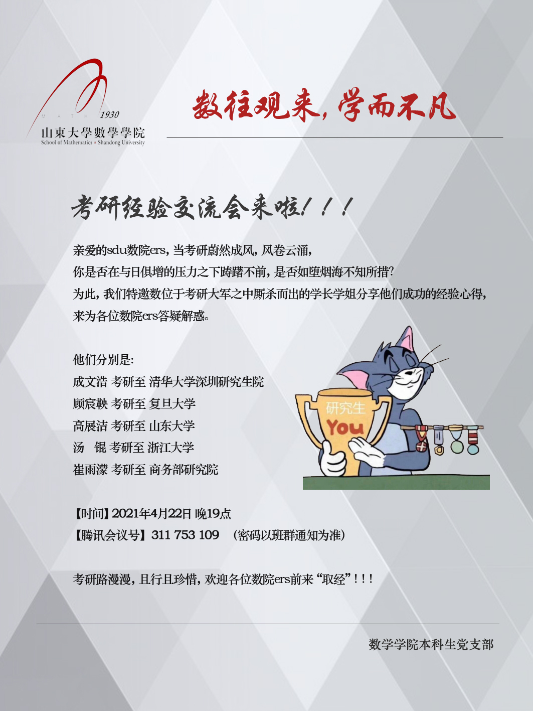 2021年研究生考试已接近尾声,为帮助数院学子了解研究生考试,科学制定考研目标,正确规划自己的学习生活,ac米兰官方中文网站本科生党支部特邀请五位学长学姐举办考研经验交流会,相关事宜如下:
