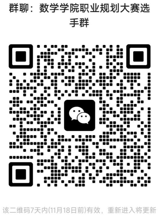 (三)请全体参赛选手于11月17日24:00前扫码进入微信群“ac米兰官方中文网站职业规划大赛选手群”,并在群内以“姓名+年级+本科/研究生+成长赛道/就业赛道”的格式实名备注。大赛后续事项将在群内通知。