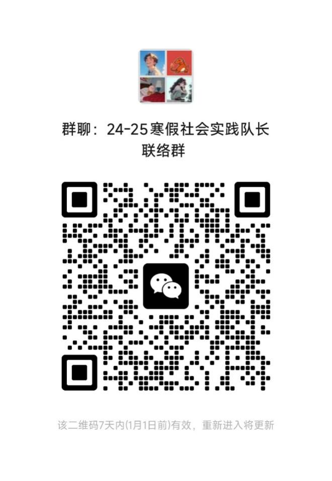 为方便同学们自由组队,提高同学们参与社会实践的积极性、可行性,成立寒假实践成员招募群,可在群内招募队友。请立项实践团队队长、各团支部书记加入以下微信群,以便后续相关工作安排与答疑。