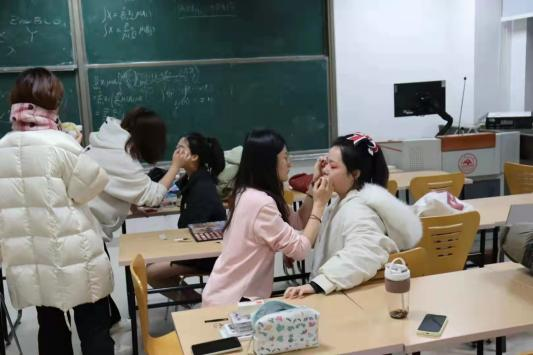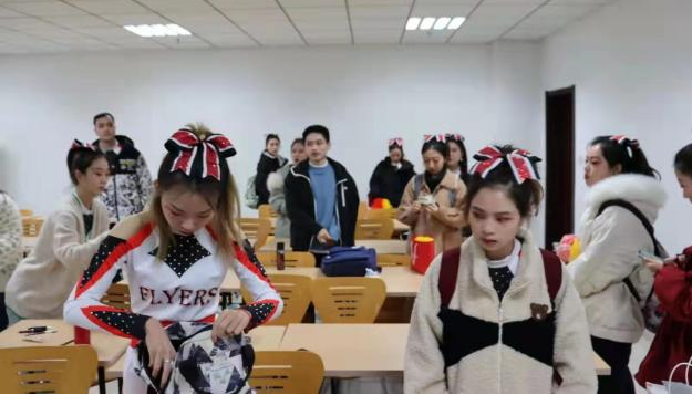 21日清晨,数学金融联队早早来到后台,在学姐们的协助下画好妆容换好队服整理好发型,满怀期待地进入候场室展开准备工作。而此时的观众席上,我院同学也早早就位,时刻准备为啦啦队成员们应援打call。