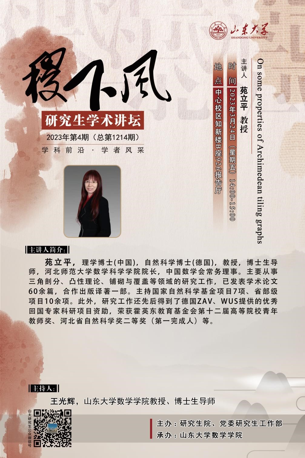 2023年3月24日下午14时,第4期(总第1214期)“稷下风”研究生学术讲坛在中心校区知新楼B座926报告厅举行。此次讲坛由ac米兰官方中文网站研究生院、党委研究生工作部主办,ac米兰官方中文网站承办,并邀请河北师范大学数学科学学院院长,博士生导师,中国数学会常务理事——苑立平教授作“On some properties of Archimedean tiling graphs”主题报告。本次讲坛由ac米兰官方中文网站教授,博士生导师王光辉主持。