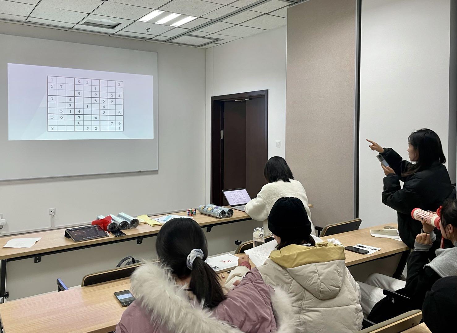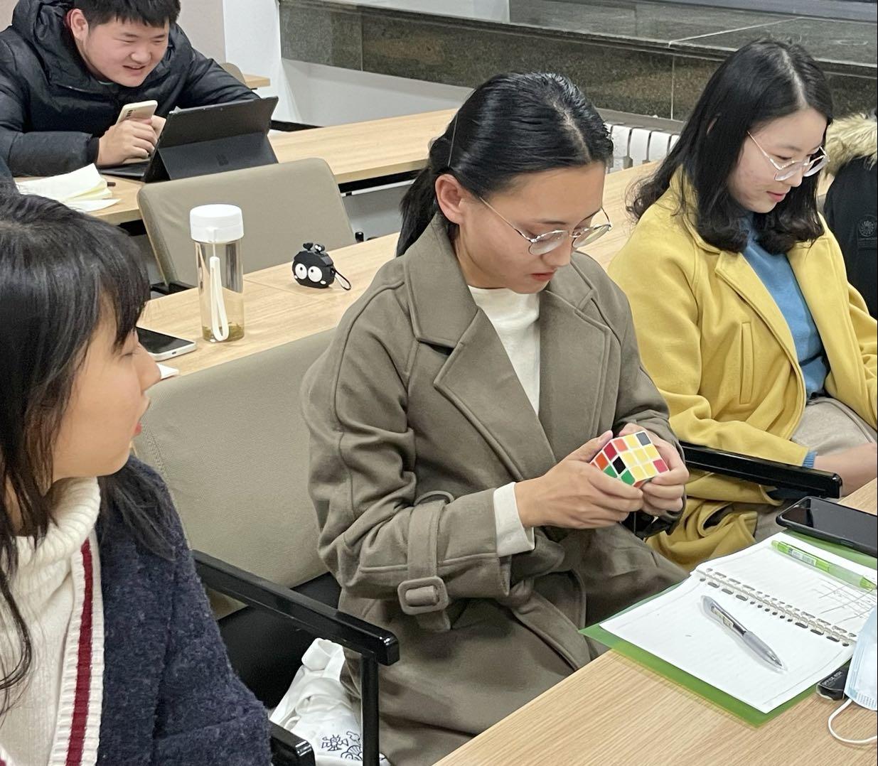 本次素质拓展活动主要包含“感悟数学之美,分享数独之乐”、“玩转24点”和“鲁比克方块”三个部分。在“感悟数学之美,分享数独之乐”中,研会成员们展现了数院学子强大的逻辑推理能力,其中徐含笑同学用时最短,拔得头筹。在“玩转24点”中,大家凭借扎实的心算基本功与反应能力用给定的符号与数字计算出24,诠释了一题多解的最高境界。在“鲁比克方块”环节,许多成员纷纷尝试还原魔方,更有高阶玩家现场教学,引得大家连连称奇。活动的最后,由各位部长亲手将奖品颁发给部员们,在欢声笑语中此次活动圆满落下帷幕。