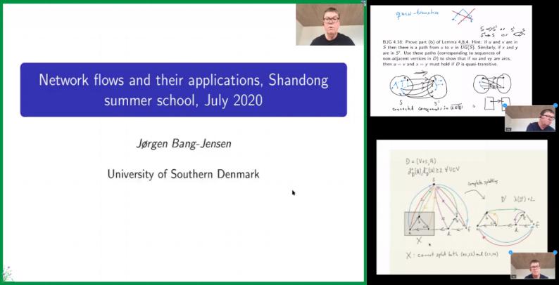 本课程共32学时。在此期间Bang-Jensen教授讲授了有向图的核心内容及前沿课题,包括网络流及其应用,有向图的性质(如连通性、哈密顿圈),特殊图类(如竞赛图、半完全图、局部半完全图、拟传递图),有向图的结构刻画,有向图算法及应用等。Bang-Jensen教授语言流利、发音标准,讲课思路清晰、深入浅出、十分透彻。授课过程中还不时提到相关数学家的趣闻轶事,为课程增添了许多趣味性。他尽职尽责,开课前后与我们往来几十封邮件讨论课程内容及习题,确认授课对象,多次修改讲义,以便顾及到各种程度的学习者;为了使线上教学更加流畅,他专门制作了图文并茂的课件,同时用手写板配合课件进行授课。除此之外,他每晚还对授课内容相关的习题进行详细讲解。前期的课程准备、连轴转的讲授使得Bang-Jensen教授有些许的疲惫,但他仍旧以饱满的热情圆满完成了教学任务。