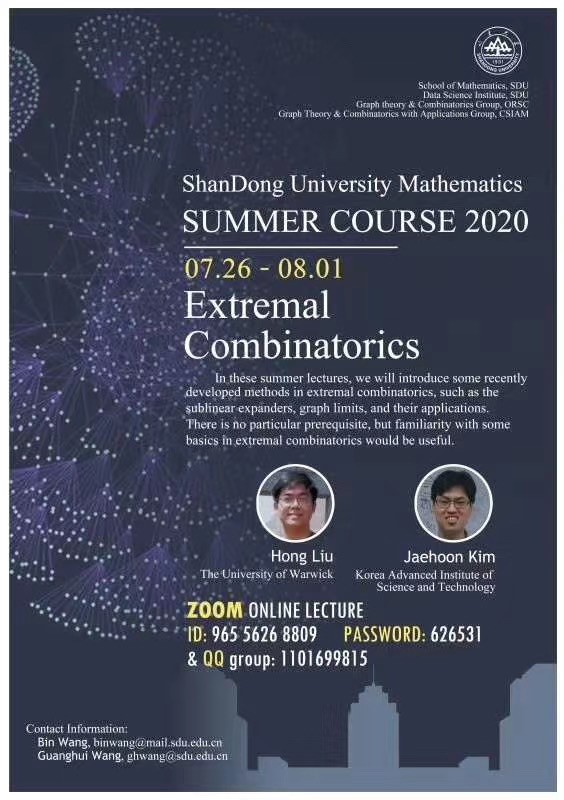 为拓宽学生的国际视野,促进学术交流,ac米兰官方中文网站于2020年7月26日-8月8日成功举办了暑期学校特色国际项目“Extremal Combinatorics”。本次暑期学校秉承“精品化、国际化、创新型、开放式”的理念,积极探索暑期线上教学模式,让身在全球各地的师生相聚云端,吸引了来自北京大学、南开大学、中国科技大学等国内知名高校以及来自韩国、英国、巴西、日本、美国等国家的青年学者、学生共300余人参加,其中包括来自巴西圣保罗大学的刘小川、日本东北大学的Masato Mimura、韩国梨花女子大学的Younjin Kim等青年学者。