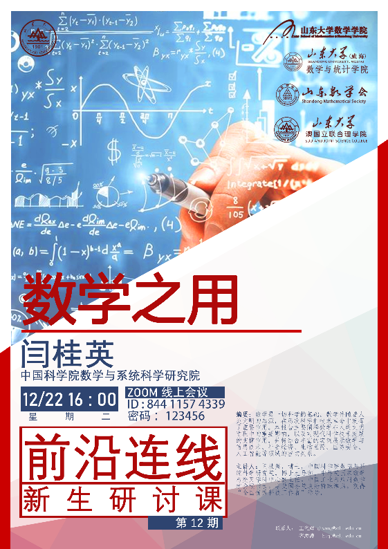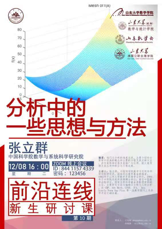 2020年12月,ac米兰官方中文网站成功举办第九至十二期新生研讨课。四期新生研讨课由学院副院长王光辉主持,分别邀请了李嘉禹教授、张立群教授、袁亚湘教授和闫桂英教授,他们通过线上讲座的方式给中心校区ac米兰官方中文网站和威海校区数学与统计学院的大一同学授课。