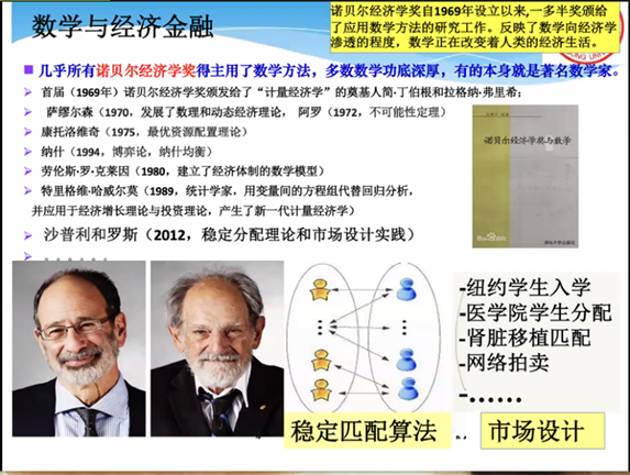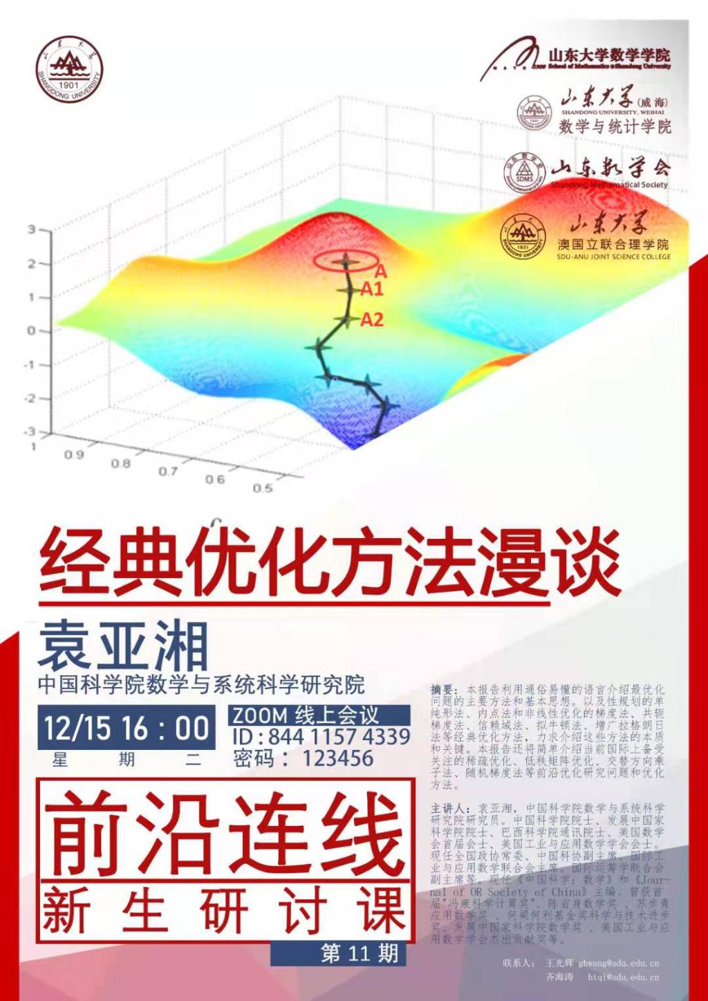 第九至十二期新生研讨课主题分别为:“从勾股定理谈起”、“分析中的一些思想与方法”、“经典优化方法漫谈”、“数学之用”。李嘉禹教授从勾股定理开始,紧贴教学实际和同学们的理解能力介绍了高斯定理、黎曼几何及几何分析的最新成果;张立群教授从分析的角度出发,主要介绍了分析学中经典的概念和主要的方程及其求解方法,涉及矩阵特征值及其推广与应用、极大值原理及其应用和积分与不等式等;袁亚湘院士简要介绍了优化的概念和应用,接着对于非线性优化问题,袁亚湘院士介绍了梯度法、牛顿法和拟牛顿法,最后袁亚湘院士还为我们简要介绍了优化中的新方法和前沿问题;闫桂英教授首先用恩格斯、伽利略、达芬奇等人的名言与谷歌的例子来阐述了数学对人类发展的重要性,又为我们介绍了数学在几个领域的应用,并用实例指出数学已成为航空航天、国防安全、生物医药、信息技术、能源、海洋、人工智能、智能交通、先进制造等领域不可或缺的重要支撑。