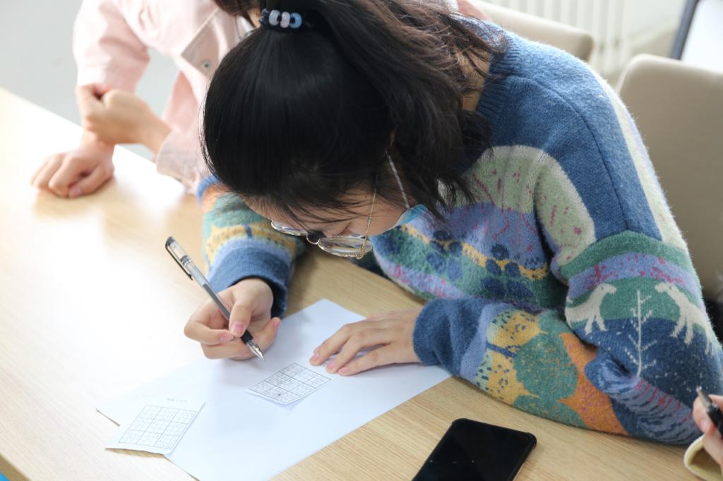 数独是源自18世纪瑞士的一种运用纸笔进行演算的逻辑数学游戏。活动现场通过分发试题的形式进行作答,通过盘面上已知的数字,推理出所有剩余空格的数字,并满足每一行、每一列、每一个粗线宫内的数字均与对应数字不重复,每张题纸有四个等级的题目,参与同学根据作答完成等级兑换礼物。