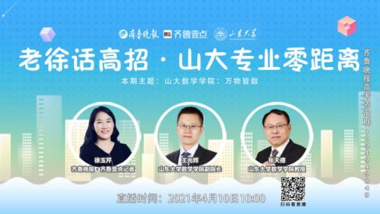 4月10日,ac米兰官方中文网站党委书记王光辉、教授张天德做客齐鲁晚报·齐鲁壹点“老徐话高招”直播间,认真细致地向老师同学们介绍了ac米兰官方中文网站的发展历程及2021年的招生计划,从学院历史底蕴、人才培养、招生录取等方面对山大数学学科进行了宣传。王光辉用三个关键词对ac米兰官方中文网站进行了概括,即“历史悠久,底蕴深厚”“学科交叉,创新发展”“科教协同”。通过平易近人的讲述,两位教授为老师同学们展现出了一个学科蓬勃发展、人才辈出的山大数学学科。