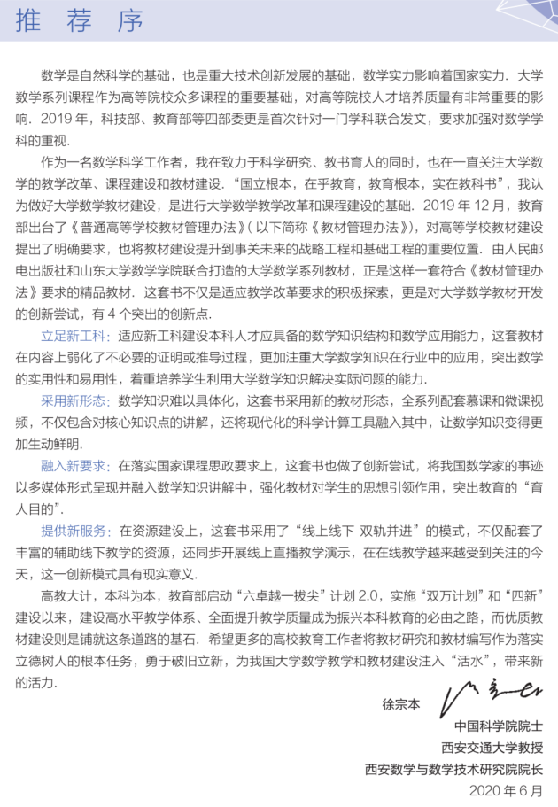 本套教材按照教育部2019年底印发的《普通高等学校教材管理办法》以及大学数学教指委对数学教学改革的要求编写,突出了课程思政的基本要素,优化了内容结构,支持线上线下混合式教学。教材对目前高校数学公共课的教学模式创新、教学案例设计、教学资源建设、课程思政建设等各个重要方面均能起到较好的支撑和参考作用,为我国高校数学一流课程建设及公共课教研改革贡献了力量。