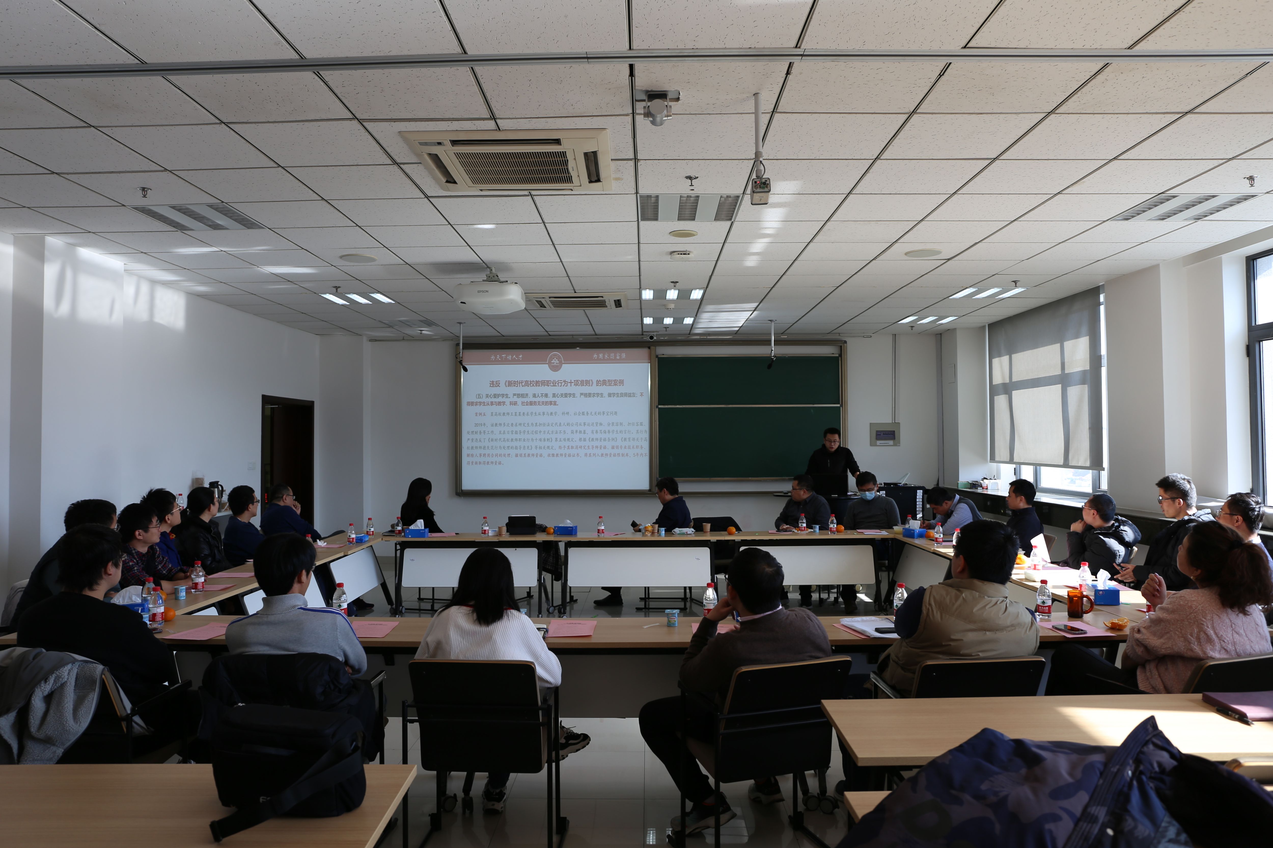 王光辉首先带来了一场新进教师师德师风及纪法规矩专题培训,给青年教师上了一堂生动的思政课。他引用大量高校领域典型案例,专题解读了新时代高校教师职业行为十项准则,积极引导在座青年教师要以立德树人为根本任务,践行师德师风各项要求,努力成长为有理想信念,有道德情操,有扎实学识,有仁爱之心的好老师。以鲜活的事例警示老师们在经费使用、师德师风等方面一定要守好底线。