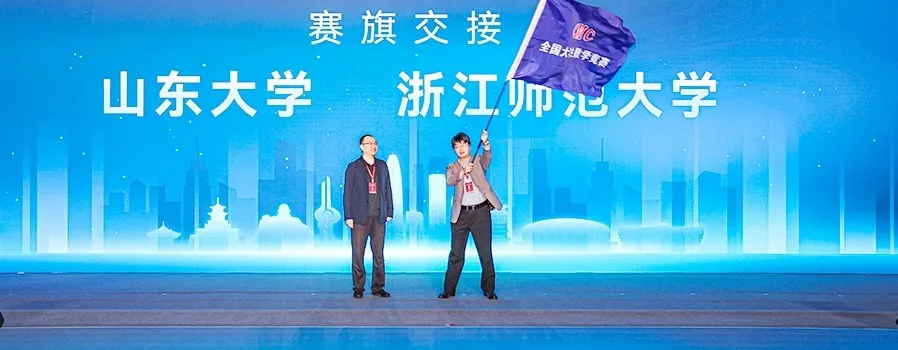第十六届全国大学生数学竞赛决赛承办单位浙江师范大学接过赛旗,并作承办宣言。