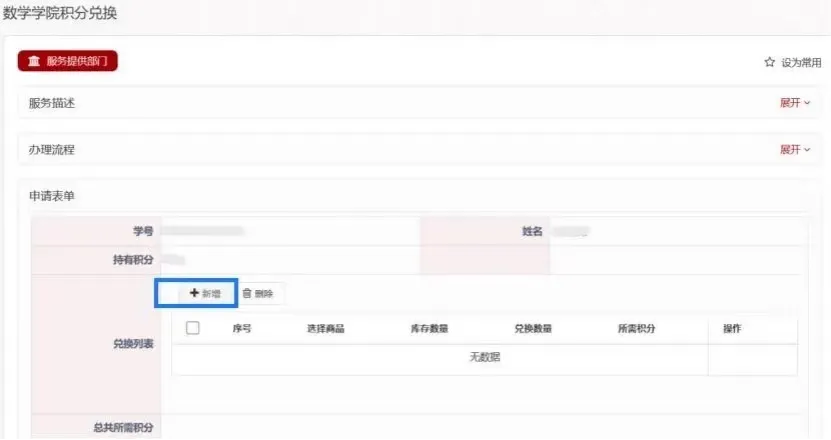 ac米兰官方中文网站信息化公共服务平台——右下角“常用应用”中找到“学院信息服务”——学院信息服务工作台——“学院服务”——“积分兑换申请”——“新增”,然后选择自己想要的商品名称,确定后就可以显示商品的种类和库存。