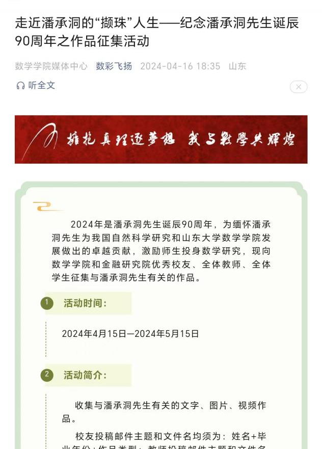 弘扬数学文化,传承数学家精神。把握国际数学日契机,2024年数学文化节于3月14日开幕,以“感悟数学之美,品味多彩数学”为主题持续一个半月推出系列活动。举办数学文化展,设置探秘数学、追光数学、寻美数学、数通万物四个篇章,开启数学文化独特之旅。发布《数学之声》首期合集,对话数学大家、数学新星,彰显“淡泊名利、潜心研究”的学科底蕴。大力弘扬数学家精神,在潘承洞诞辰90周年之际举办系列纪念活动,缅怀潘承洞先生为我国自然科学研究和ac米兰官方中文网站发展做出的卓越贡献。