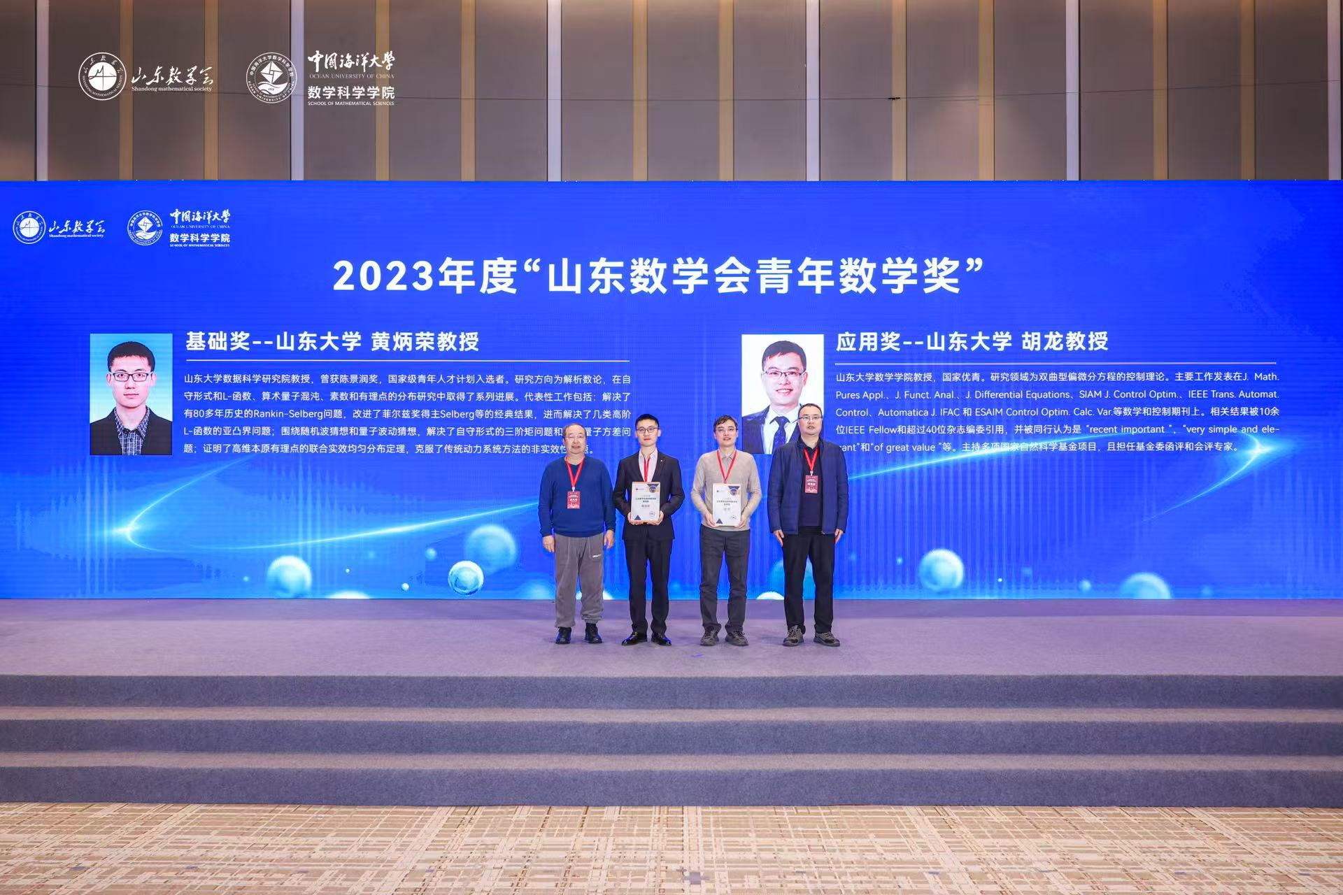 山东数学会将青年数学奖基础数学奖授予黄炳荣教授,将青年数学奖应用数学奖授予胡龙教授,以表彰他们在学术领域作出的突出贡献。颁奖词中指出,黄炳荣教授解决了有80多年历史的Rankin-Selberg问题,改进了菲尔兹奖得主Selberg等的经典结果,进而得到了几类高阶L-函数的亚凸界结果;围绕随机波猜想和量子波动猜想,解决了自守形式的三阶矩问题和几类量子方差问题;证明了高维本原有理点的联合实效均匀分布定理。胡龙教授在双曲系统的镇定性、能控性和同步性等方面取得了多个突破性的原创结果,包括解决了自20世纪80年代以来长期悬而未决的拟线性非齐次双曲系统的边界镇定问题;找到了线性非齐次双曲系统精确能控的临界控制时间;建立了拟线性耦合波动方程组的边界同步性,填补了非线性双曲同步研究的空白。