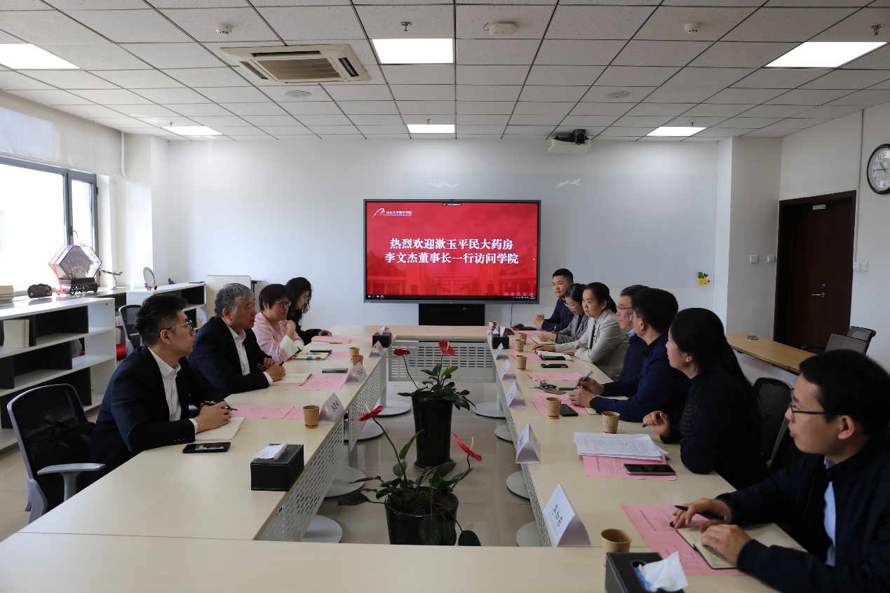 4月15日,漱玉平民大药房连锁股份有限公司董事长李文杰一行访问ac米兰官方中文网站,围绕校企协同创新、人才培养、产学研深度融合等方面展开深入探讨。ac米兰官方中文网站常务副校长、ac米兰官方中文网站院长吴臻,漱玉平民大药房连锁股份有限公司董事长、ac米兰官方中文网站1980级校友李文杰,ac米兰官方中文网站党委书记王光辉参加座谈会。会议由ac米兰官方中文网站党委副书记王苗雨主持。