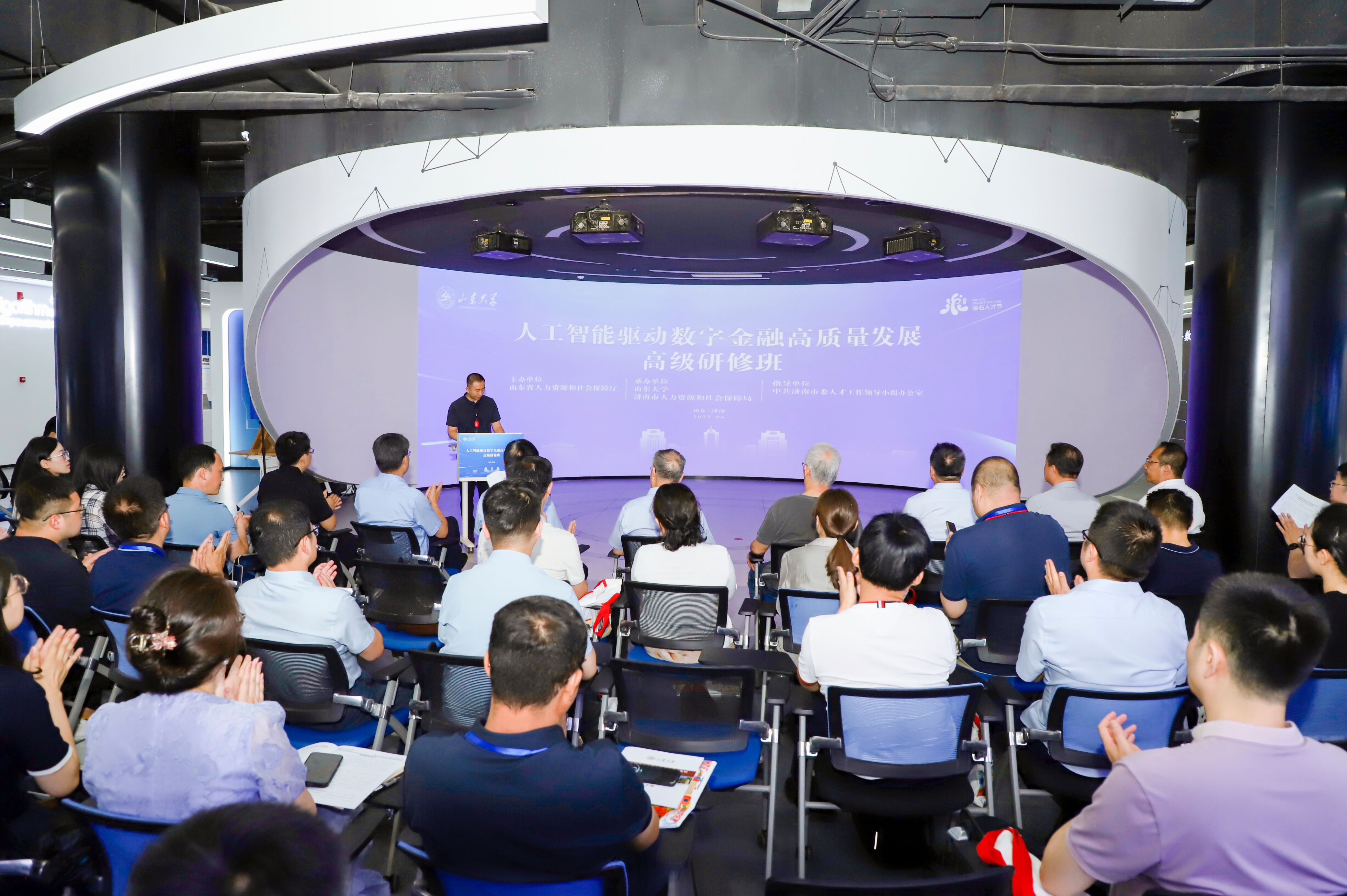 本届人工智能驱动数字金融高质量发展国家级高级研修班为期5天,作为济南市第三届“海右人才节”系列活动之一,经人力资源社会保障部批准,由山东省人力资源和社会保障厅、中共济南市委人才工作领导小组办公室主办,ac米兰官方中文网站、济南市人力资源和社会保障局承办。来自全国科技金融领域金融机构、企业的相关负责人及中、高级专业技术骨干50余人参加研修学习。高研班立足人工智能这一热门领域,探讨AI时代下金融行业发展的数字化实现方向与路径,对支持引领数字金融高质量发展、培养高层次专业技术人才队伍、推动新质生产力发展具有重要意义。